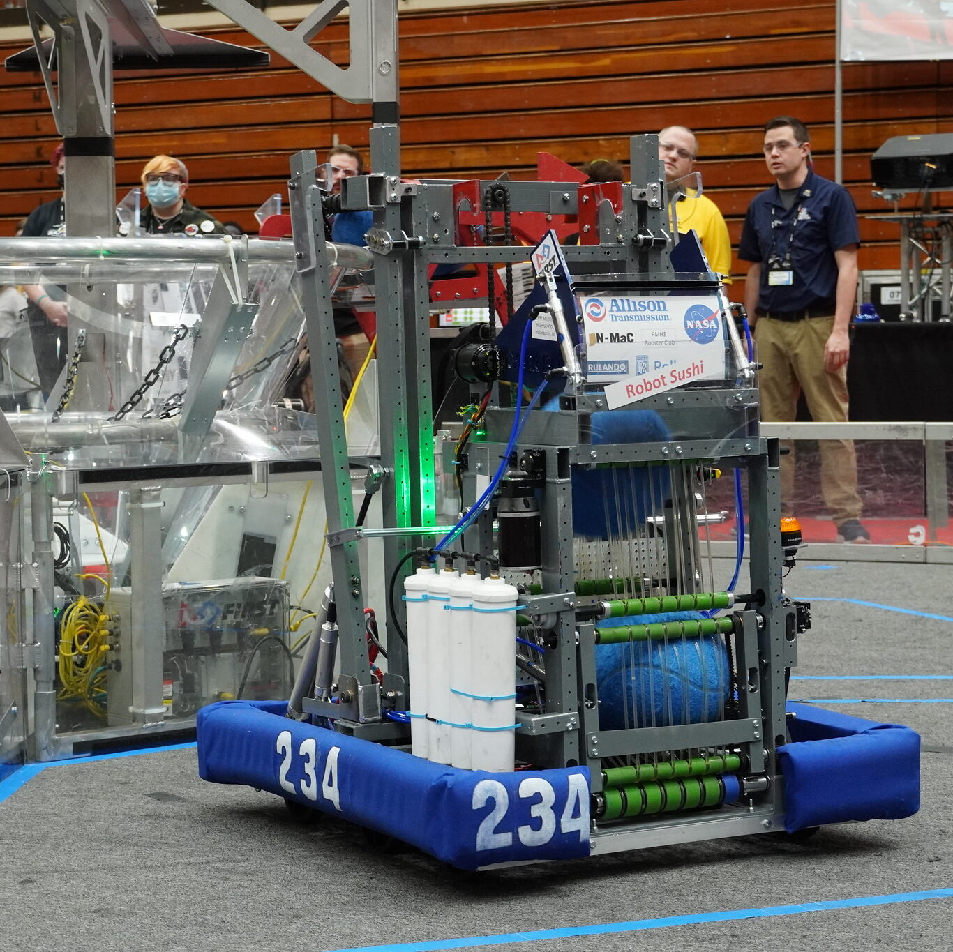 “Sushi” Our 2022 robot had a collecting and shooting system that was effective for completing this year’s task of collecting cargo and launching it into hubs that stood over eight feet in the air. We also employed an unique climbing mechanism that came in clutch for many wins.