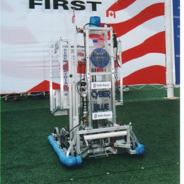 This robot, called Beef Shredder, was designed to pick up soccer balls with a conveyor belt. It had a 4-wheel drive and featured an original design transmission from the TechnoKats. Much of the framework was based on the 2001 robot’s framework.