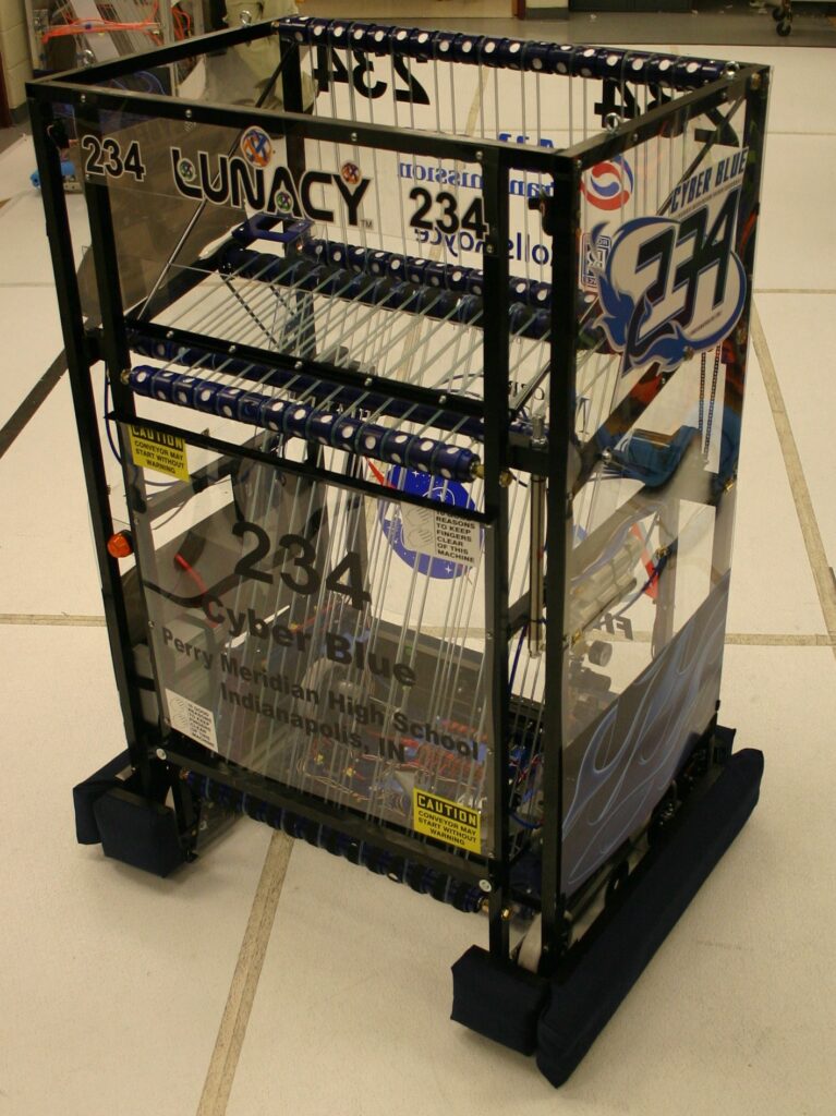 Caroline XI had a “simple, yet elegant design” (Eric Engebretsen, a guest engineer from Rolls-Royce at Cyber Blue’s 2009 Critical Design Review). After debating several chassis designs, we decided to use the provided frame and create a four-wheel wide style chassis for FIRST’s 2009 game, Lunacy. It was driven by two CIM motors, each geared through an AndyMark GEM500 Planetary Gearbox. The lift was a dual conveyor, which means that one set of conveyor material off-set eight inches from the other. These two rollers were set at an approximate sixty-degree angle, with a hopper at the top portion of the robot large enough to hold between fifteen and twenty orbit balls. The door opened by two, ten-inch pneumatic cylinders when our “powered dumper” (mentor Kevin Kelly) came within range of our target. Caroline XI was a straightforward, effective approach to Lunacy.